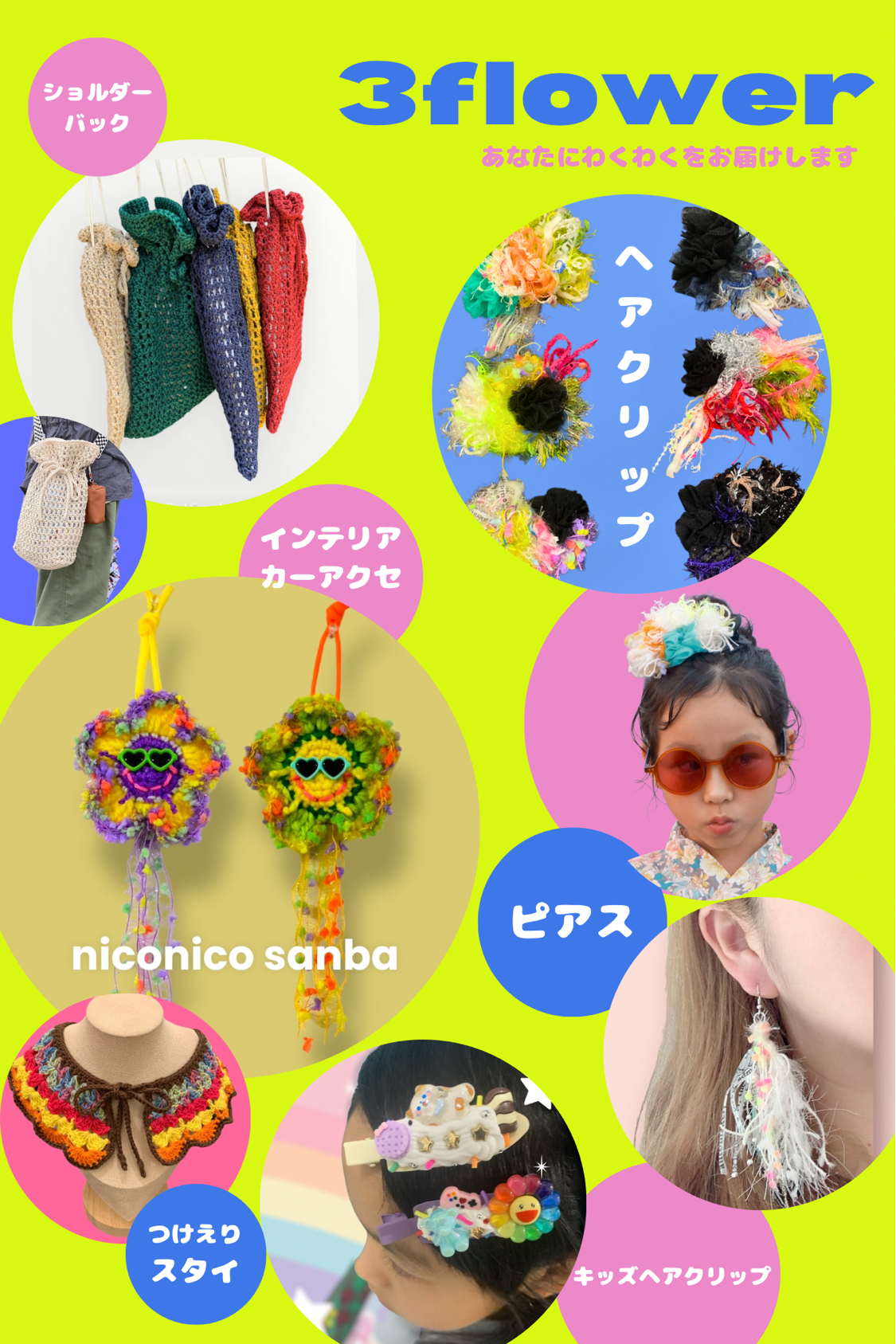 編み物で作ったハンドバッグ、付け襟等の販売をしています。車につけるカーアクセサリー【ニコニコサンバ】は一推し商品です♪