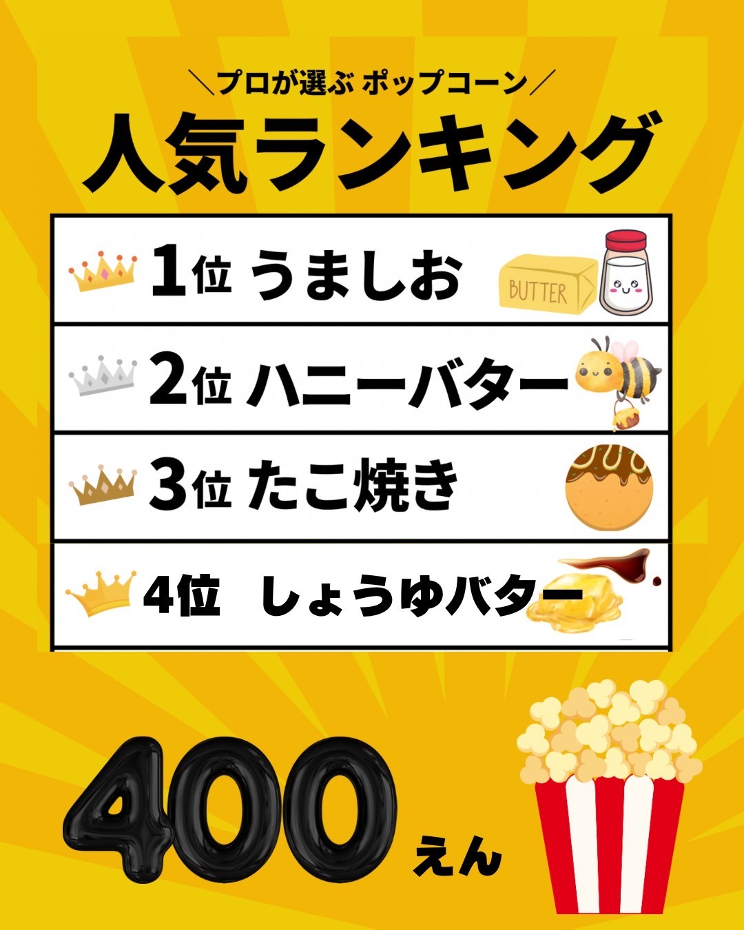 うましお、ハニーバター、たこ焼き、しょうゆバターの4つの味からお選びください。