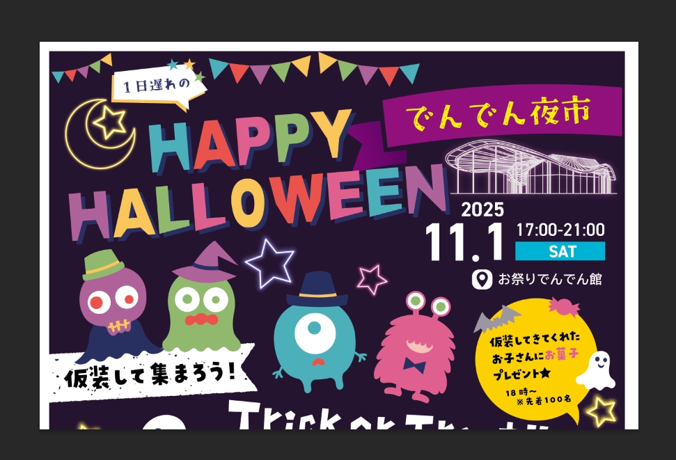 2025.10.10 お知らせ、イベント、デザイン mune_admin 11.1 でんでん夜市★1日遅れのHAPPY HALLOWEEN★出店紹介 Tweet Share +1 Hatena Pocket RSS feedly Pin it ただいま準備中です★ 詳細お待ちください Tweet Share +1 Hatena Pocket RSS feedly Pin it