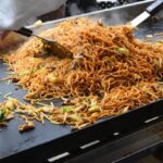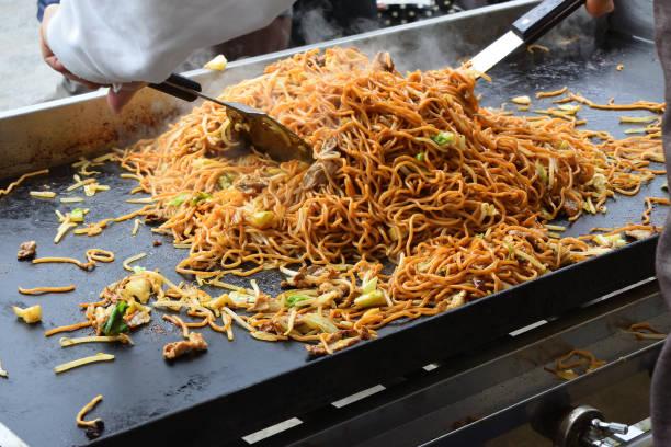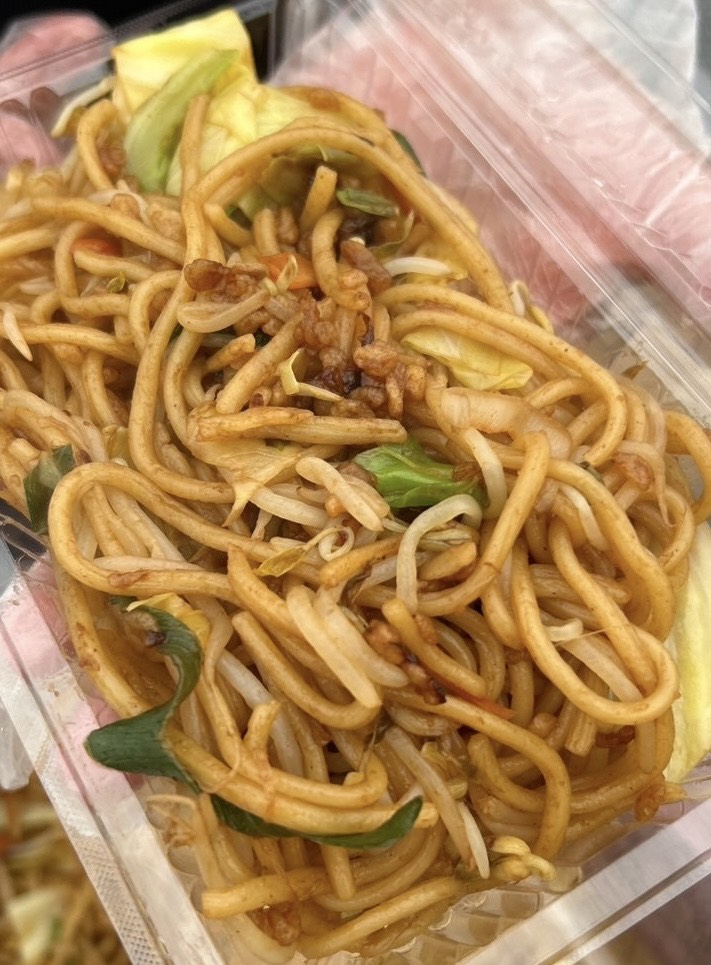 じゃがもちフランク、焼きそば、温かいスープ、ドリンク