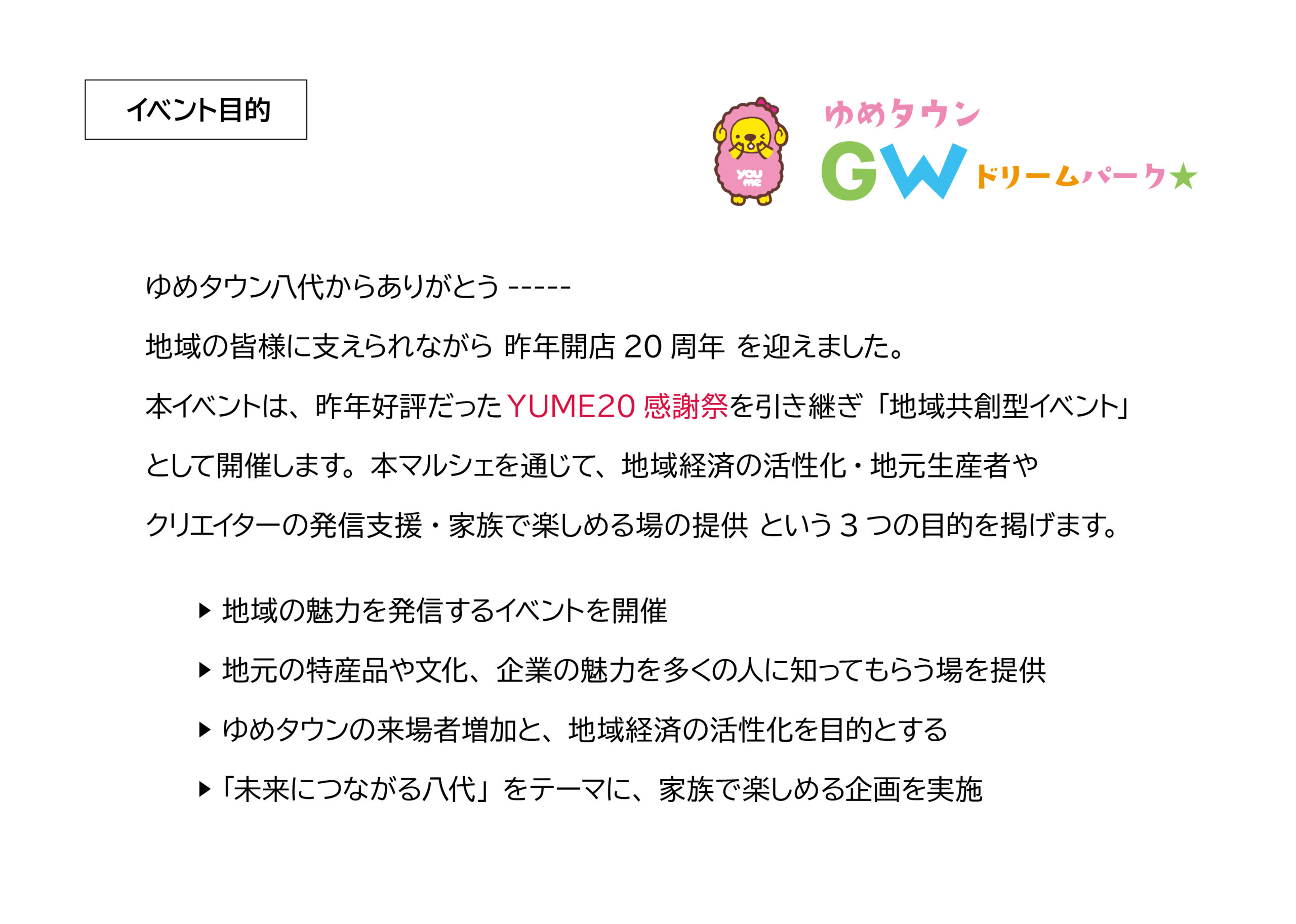本イベントは、昨年好評だったYUME20感謝祭を引き継ぎ「地域共創型イベント」として開催します。本マルシェを通じて、地域経済の活性化・地元生産者や