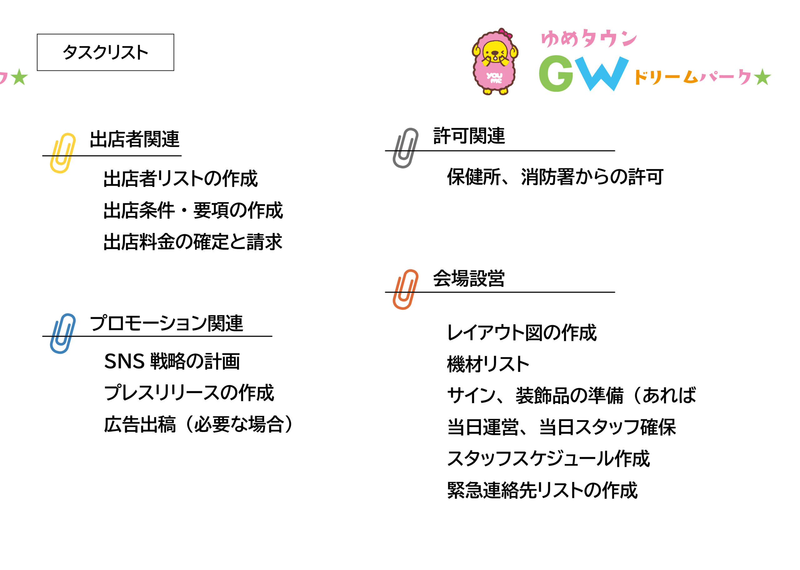 - 会場にゴミ箱の設置はありません。飲食店舗はゴミ箱を必ず各店舗1つご準備頂き、各自で持ち帰り、清掃を徹底お願いいたします。他のお店のゴミもお持ち込みの場合は受け入れお願いいたします。