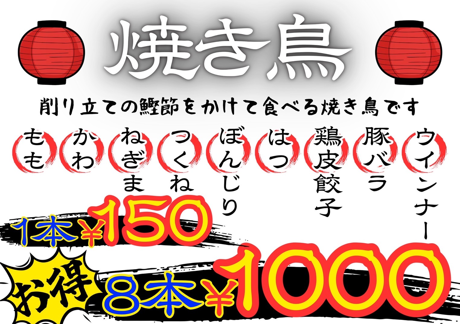 地鶏の炭火焼き、鶏丼、ロングポテト、揚げたこやき、レモンスカッシュ、メロンソーダーフロート、ういちゃんのほっぺ(アイス)