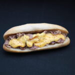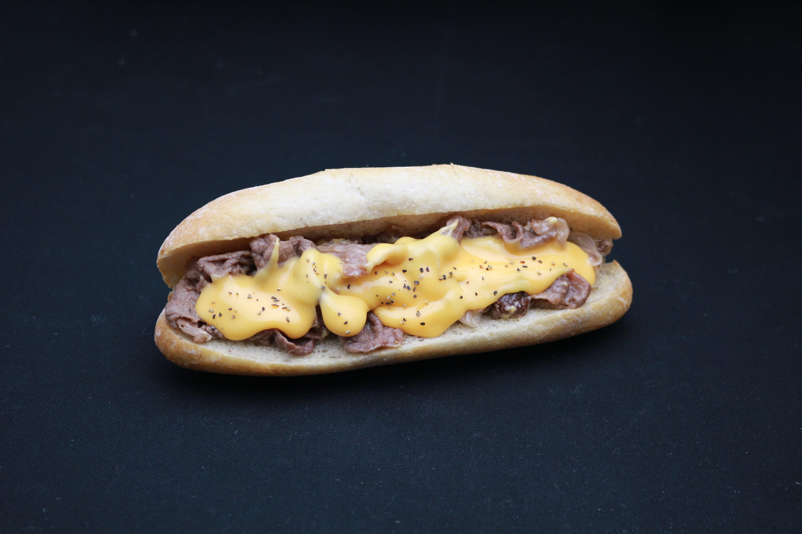 熊本県産牛のうす切り肉を天草の塩で味付けし玉ねぎと一緒に焼き上げ、たっぷりの濃厚なチーズソースとブラックペッパーをトッピングしたボリューム満点なチーズステーキサンドです